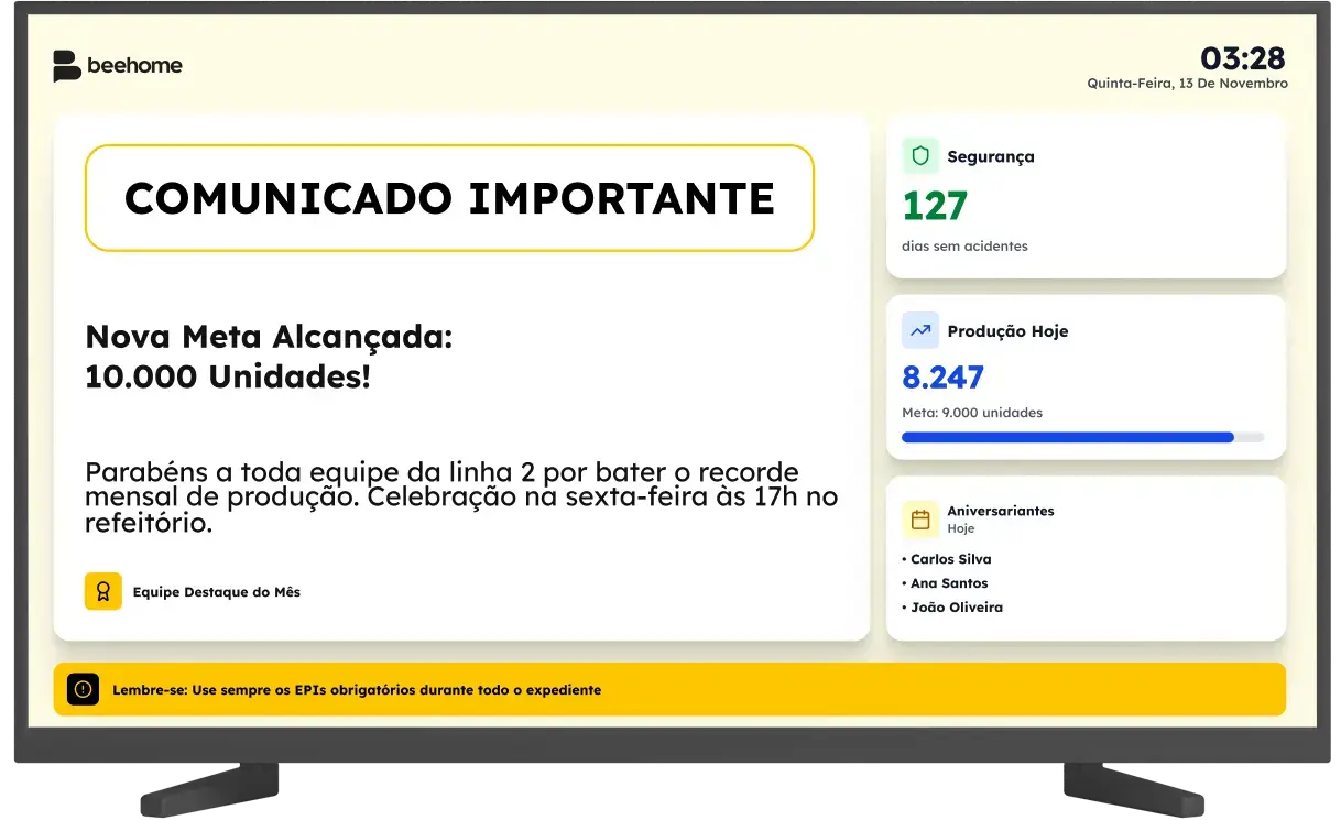 Muitos colaboradores não estão diante do computador. Com os add-ons, sua empresa comunica por telas físicas, WhatsApp, vídeo e assistentes inteligentes, garantindo que mensagens críticas cheguem a todos sem atraso ou perda de contexto.