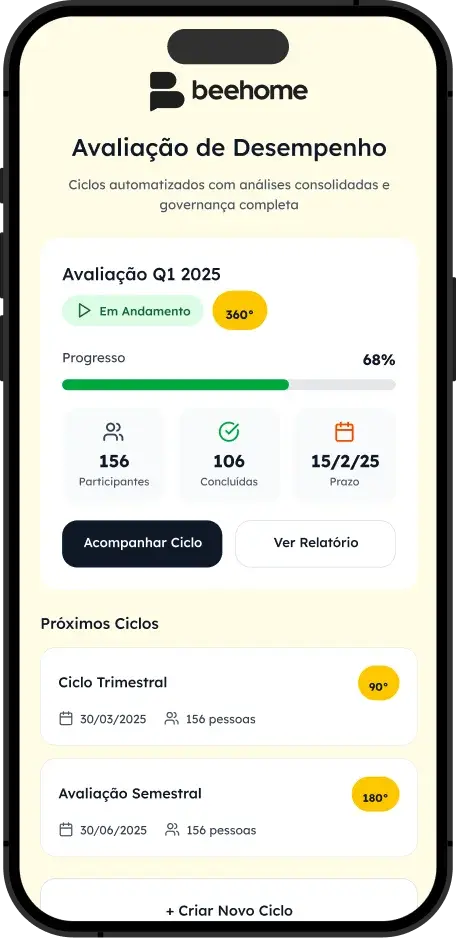 O Beehome Avalia resolve esse cenário. Ele reúne ferramentas de avaliação de desempenho, feedback, metas e evolução em um ecossistema único, com lógica e rastreabilidade. Os líderes ganham clareza; os colaboradores entendem expectativas; o RH coordena ciclos completos sem depender de fluxos improvisados.