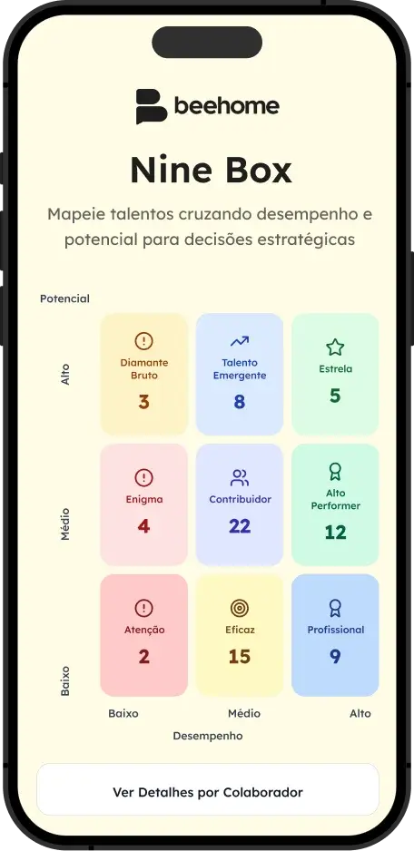 Contratar Beehome AvaliaMapeie talentos visualmente cruzando desempenho e potencial para planejar sucessões e promoções com mais segurança.