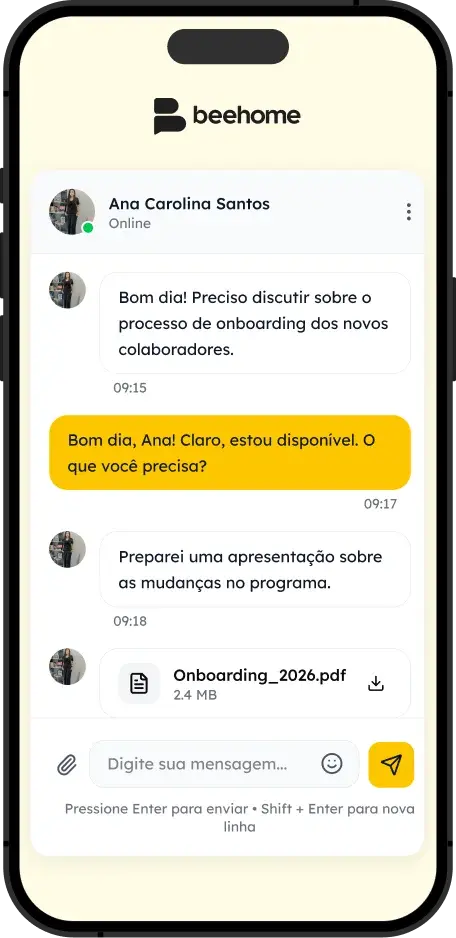 A inteligência artificial que entende sua empresa. Um assistente virtual 24/7 se integra aos produtos Beehome para responder dúvidas, ler PDFs e imagens com base no conteúdo da plataforma.