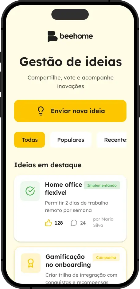 O painel do Beehome Engaja mostra, em tempo real, as pessoas mais ativas, as ações mais engajadas e onde estão as maiores oportunidades de estímulo. A gestão de ideias complementa esse movimento, trazendo visibilidade para iniciativas internas. A empresa consegue identificar talentos e monitorar o clima com base em dados.