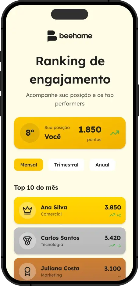 Transforme a rotina corporativa em conquistas diárias com uma plataforma de engajamento de colaboradores que usa gamificação, recompensas e rankings para aumentar motivação e fortalecer cultura. O Beehome Engaja vai manter sua equipe sempre conectada aos objetivos do negócio.