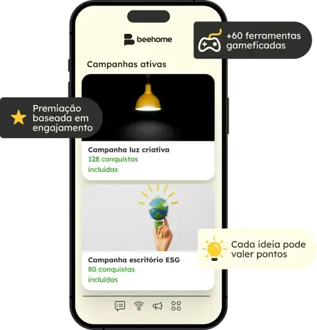 Com as ferramentas de Gamificação do Beehome Engaja, a empresa cria campanhas de engajamento, define metas e estimula a participação das equipes por meio de sistemas de pontos, rankings e recompensas reais.