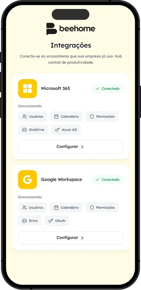 Conecte usuários, agendas e arquivos do ecossistema que a sua empresa já utiliza para centralizar a produtividade em um único hub.